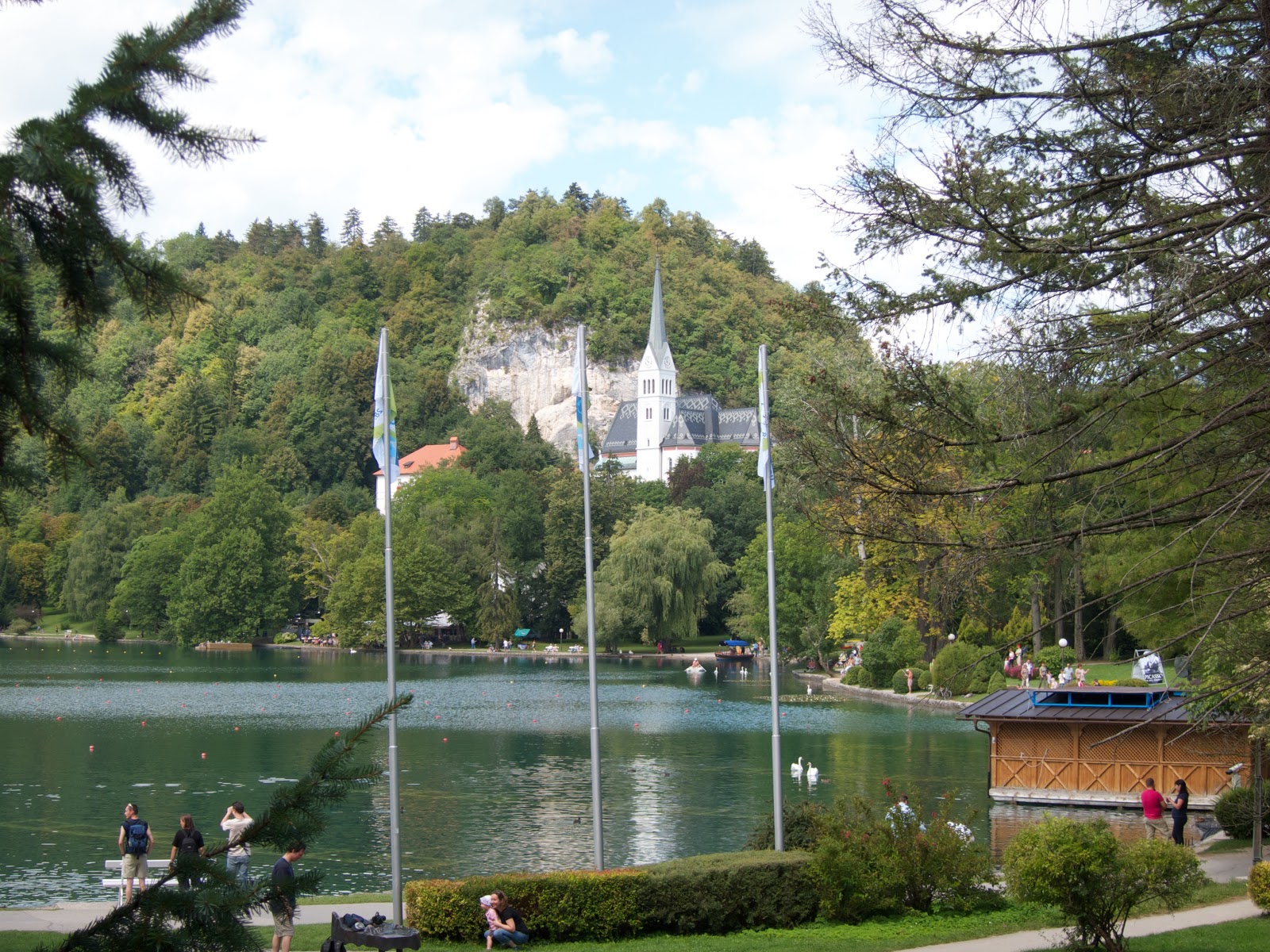Lake Bled is picture-postcard pretty, but there is no dedicated motorbike parking and apparently, as long as you're not obstructing anyone, you can pretty much park where you like. Still one's person's non-obstruction is not necessarily the same as another's. We managed to find a space and parked up. We had a walk up and down the banks of the lake, and then opted for pizza for lunch. Blokes going barmy over the wasps...
